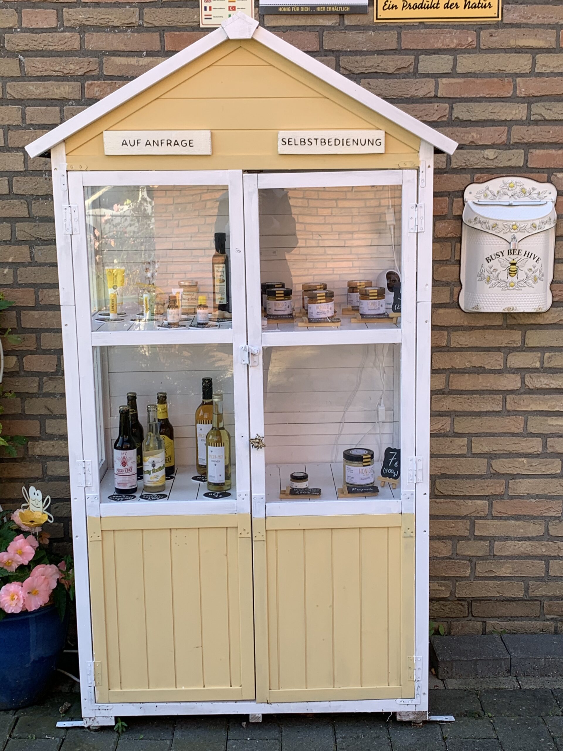Die Idee ist uns während der Corona Krise gekommen, da viele Kunden sich nicht getraut hatten, direkt an die Haustür zu kommen. Durch den Honigschrank konnten die Kunden kontaktlos ihren Honig kaufen und waren auch nicht an Öffnungszeiten gebunden. Was erst als temporäre „Notlösung“ geplant war, wurde so gut von den Kunden angenommen, dass er zu einer festen Institution bei uns in der Imkerei geworden ist. Selbst die hiesigen Medien hatten über den Schrank berichtet und er hat einen Innovationspreis gewonnen.
